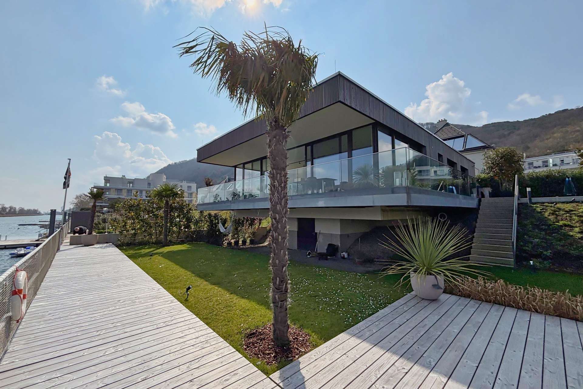 Moderner Bungalow mit großen Terrassen und Zugang zum Kuchelauer Hafen, Parken außerhalb des Areals, Anlieferung über Tiefgarage möglich (2 Stellplätze)
