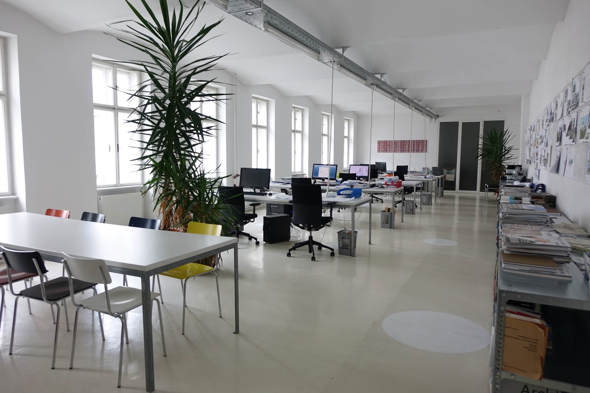 Bright, modern open-plan office with garden in the courtyard